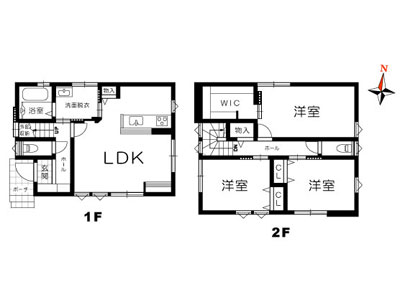 [1F]LDK14.7、洗面兼サンルーム、浴室、トイレ、外部収納 [2F]洋8.3+WIC、洋5.8、洋5.8、トイレ |