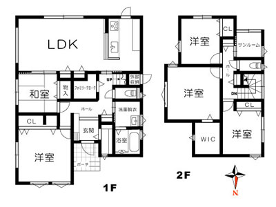[1F]LDK18、和4.5、洋8、トイレ、浴室、洗面、ファミリークローク、シューズクローク、外部収納 [2F]洋8+WIC、洋5.3、洋5.3、サンルーム、トイレ |