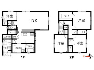 [1F]LDK21.4、洋3、洗面兼サンルーム、浴室、トイレ、シューズクローク [2F]洋8+WIC、洋6、洋6、トイレ |