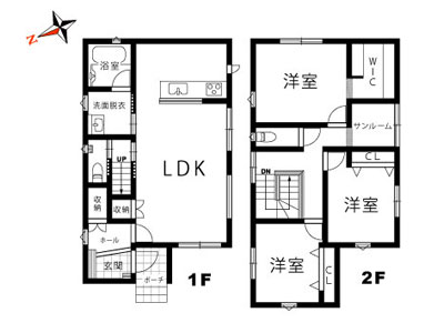 [1F]LDK17、洗面、浴室、トイレ [2F]洋7+WIC、洋5.3、洋5、トイレ、サンルーム |